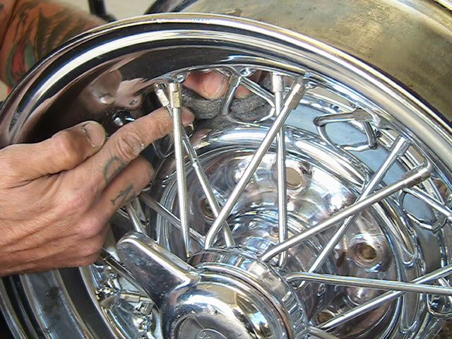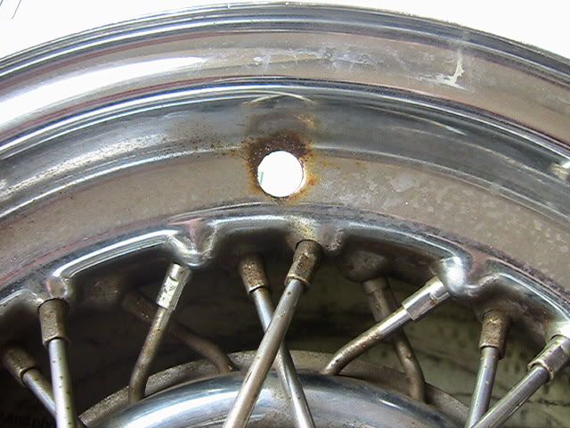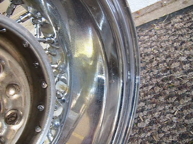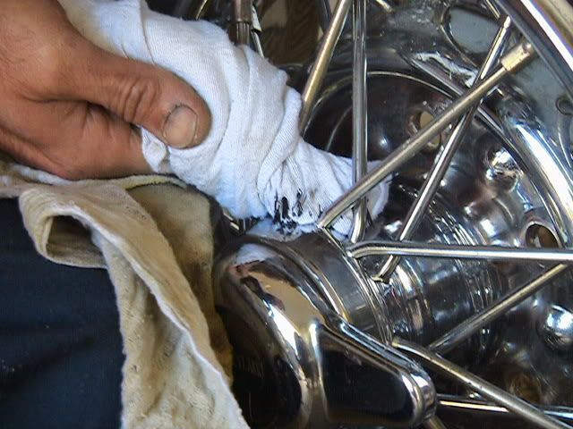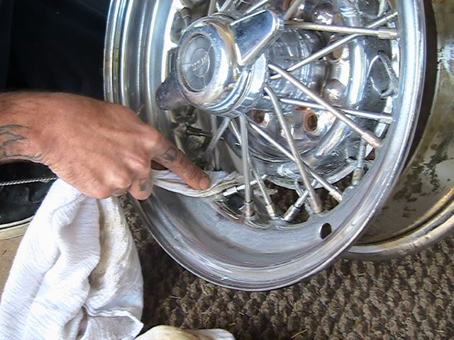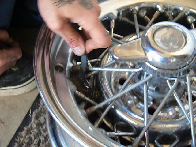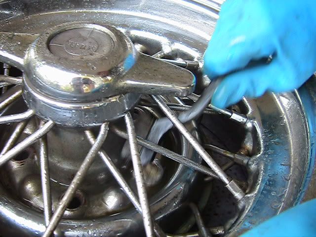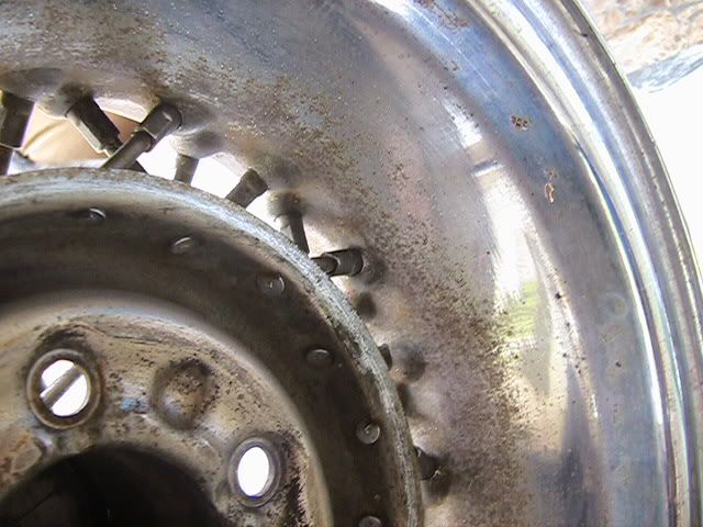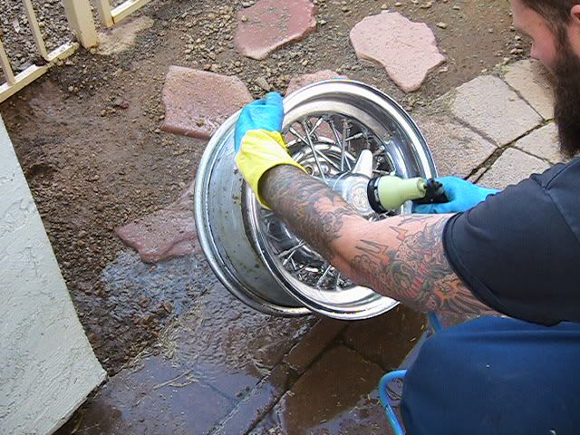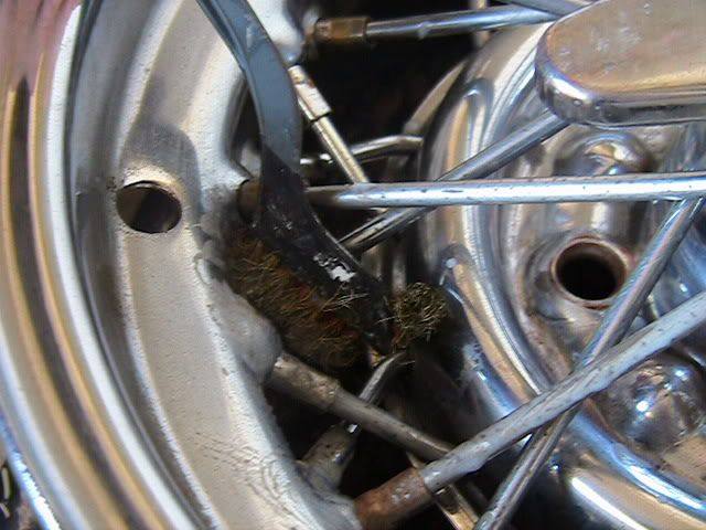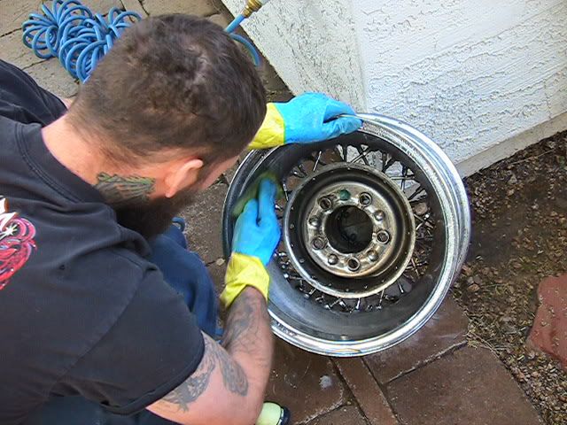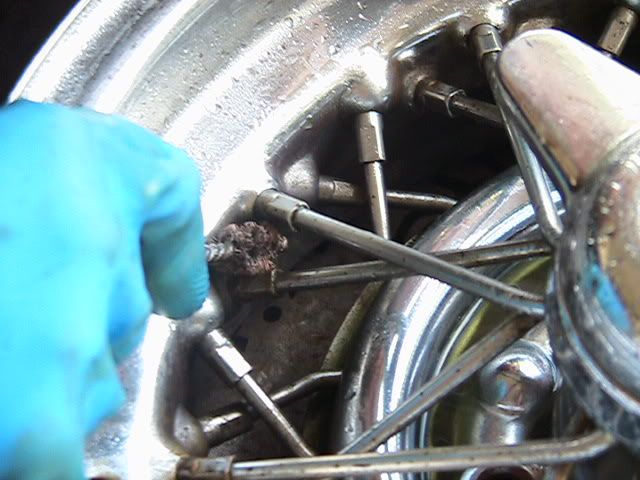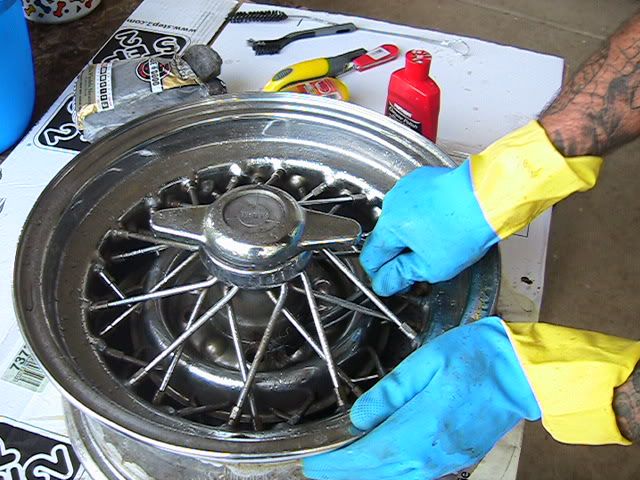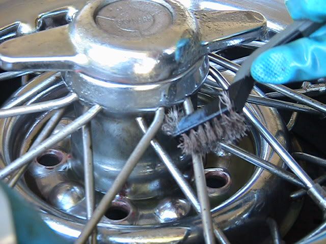Squirt it down with the acid, and scrub it with the steel brushes. Get into all the nooks and crannies. It's amazing how good the acid works! The stuff just falls off. It seems to me the wire brushes don't scratch the chrome, but the rough side of scrubbie does. I used the scrubbie on the backside of the rim.